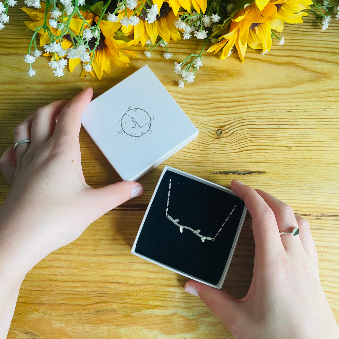 Your branch & leaf bar necklace will come packaged in a pearlescent ivory JL box with peach tissue paper & a silver card card explaining how best to look after your ring and keep it sparkling!