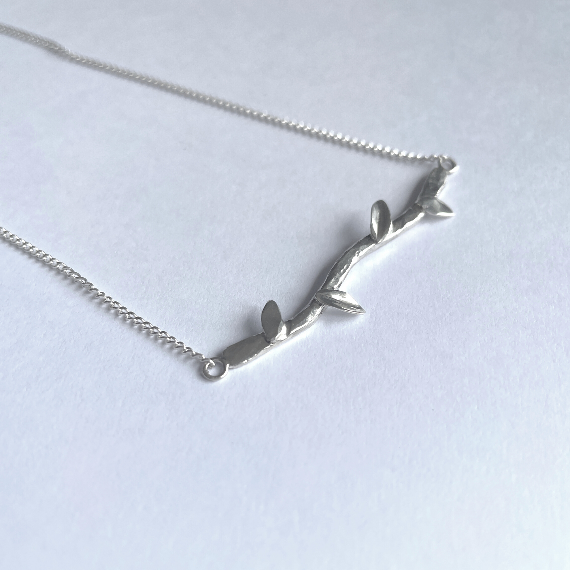 This necklace was inspired by leaves on a branch, the hammered effect gives an organic feel to the pendant with the high polish leaves creating a contrast. This necklace is perfect for everyday wear!