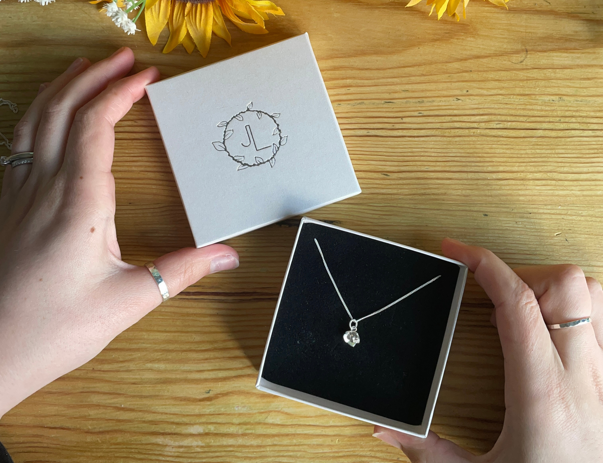 Your pendant will come packaged in a pearlescent ivory JL box with peach tissue paper & a silver care card explaining how best to look after your jewellery and keep it sparkling!
