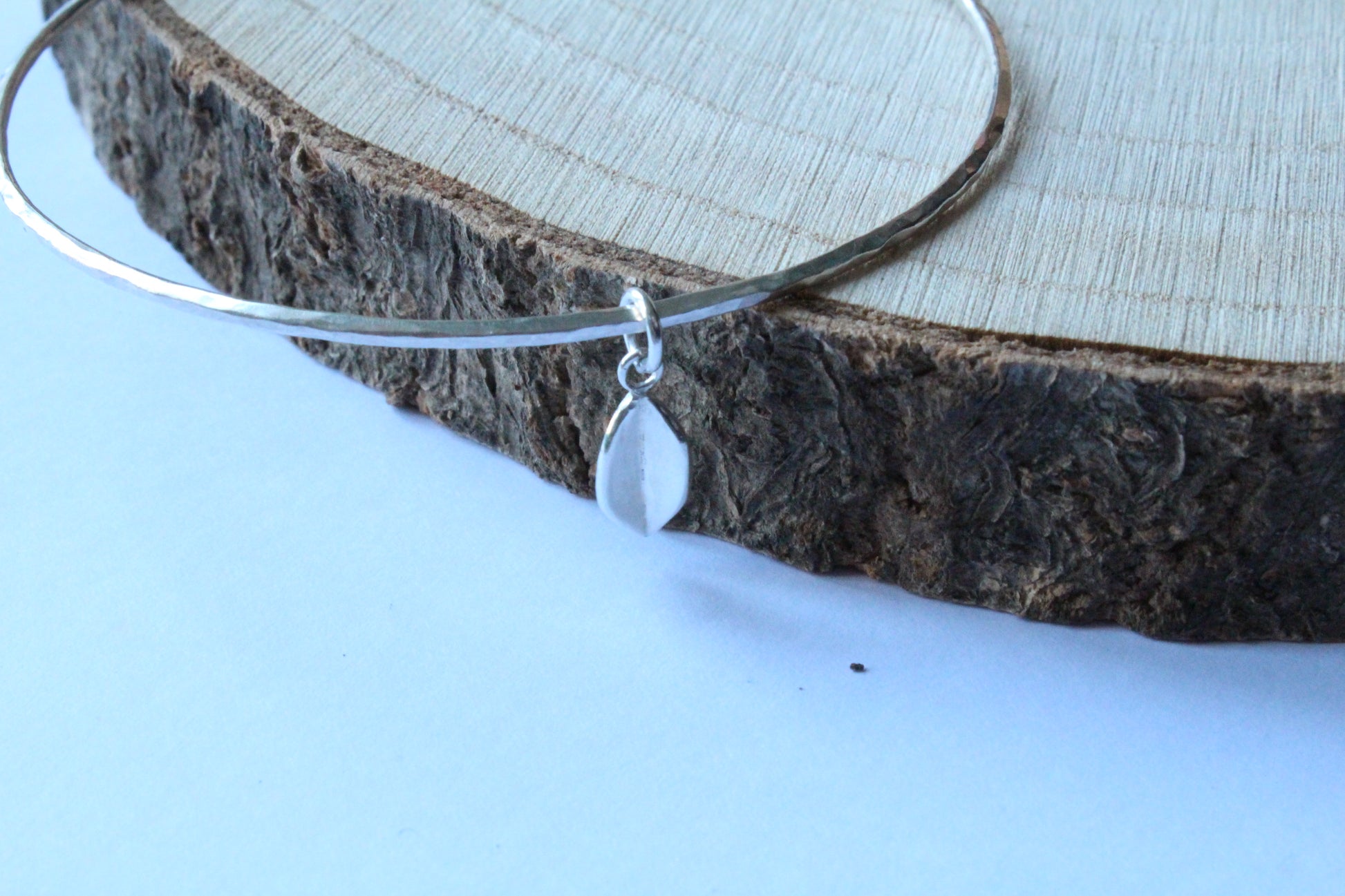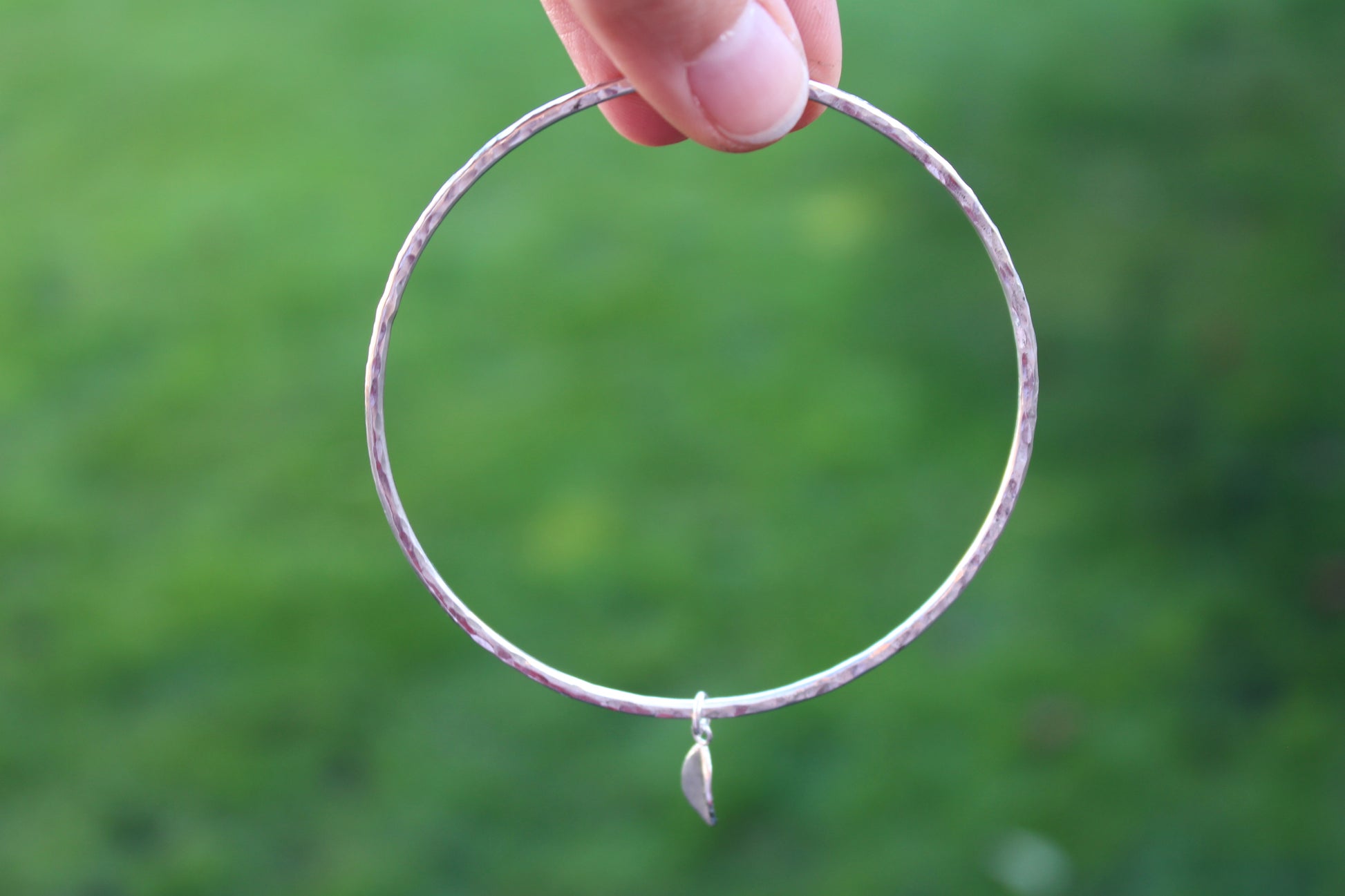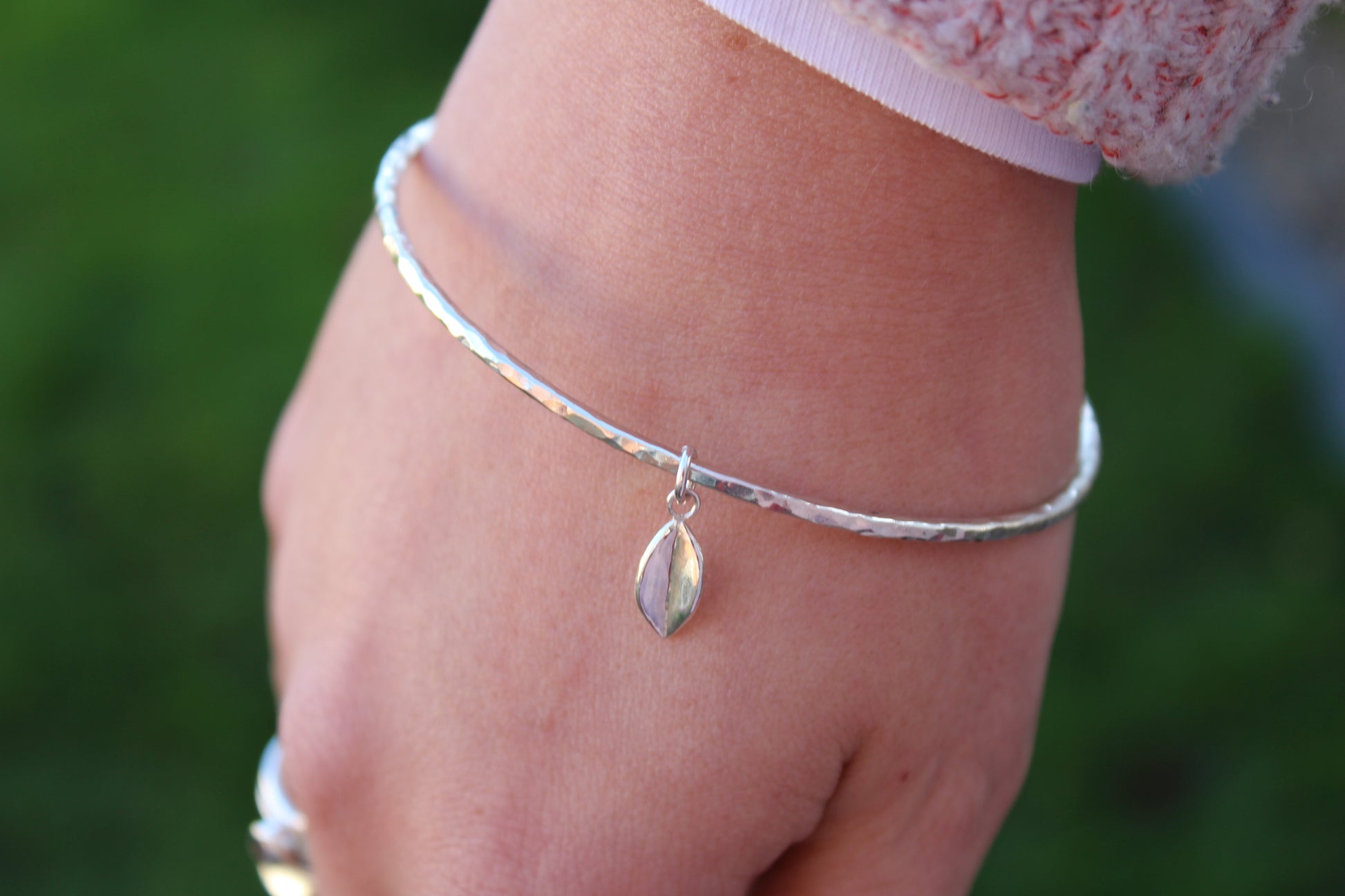 This bangle will never go out of style, can be stacked with as many other bangles as you'd like! The leaf charm really makes this a perfect gift for that special someone!